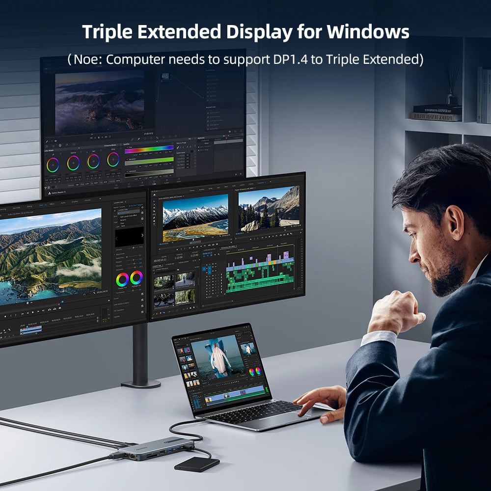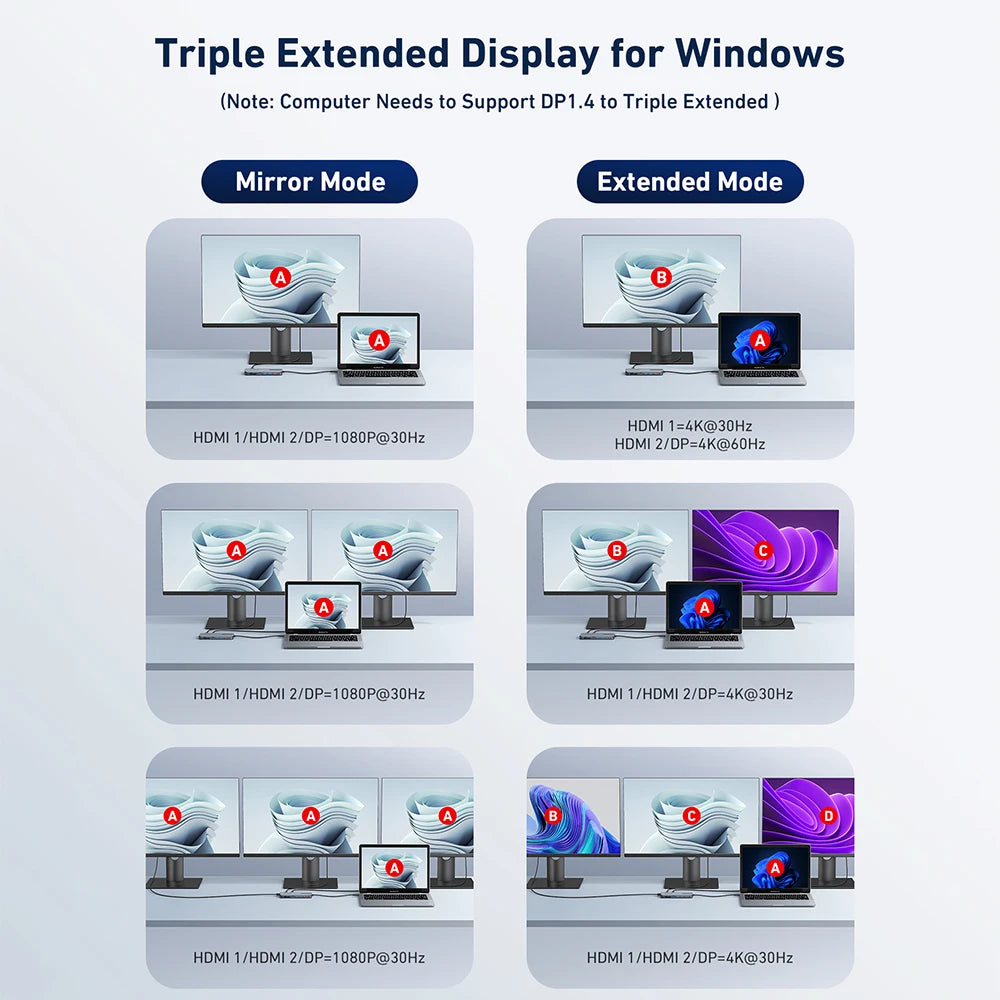 - Triple-display capability with 2x HDMI and 1x DisplayPort 1.4 outputs up to 4K@60Hz, plus SD/TF card readers; you can run Windows driver-free in ABCD mode, while Mac OS supports modes.